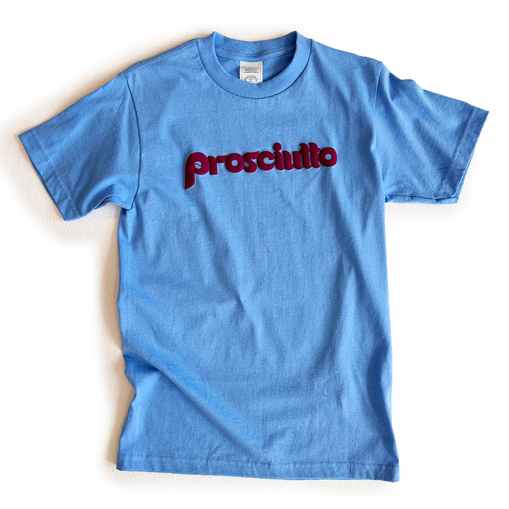 Celebrate your love for Philly with the Philly Prosciutto T-Shirt from The Deli Collective. Featuring a playful design that combines the iconic retro Philly aesthetic with a touch of Italian flair, this tee is a must-have for any food and baseball fan. Available in powder blue and burgundy, this shirt offers a comfortable fit for everyone. It's perfect for adding a fun twist to your casual wardrobe.